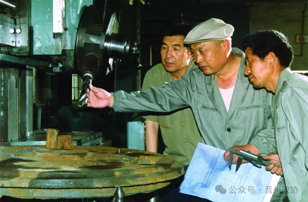 1990年6月,河北轴承厂厂长赵杏林(中)在车间与工人师傅一起研究生产工艺。赵杏林1987年任河北轴承厂厂长,秉持“以规模促发展、以技改上水平”的思路,兼并4个濒临破产企业,并开展大规模技术改造,企业技术装备水平跃居全国同行业先进行列。1990年,任晋县第七届政协副主席。1992年,任晋州市第一届政协副主席。是第八届全国人大代表、全国机械工业劳动模范。2004年去世。