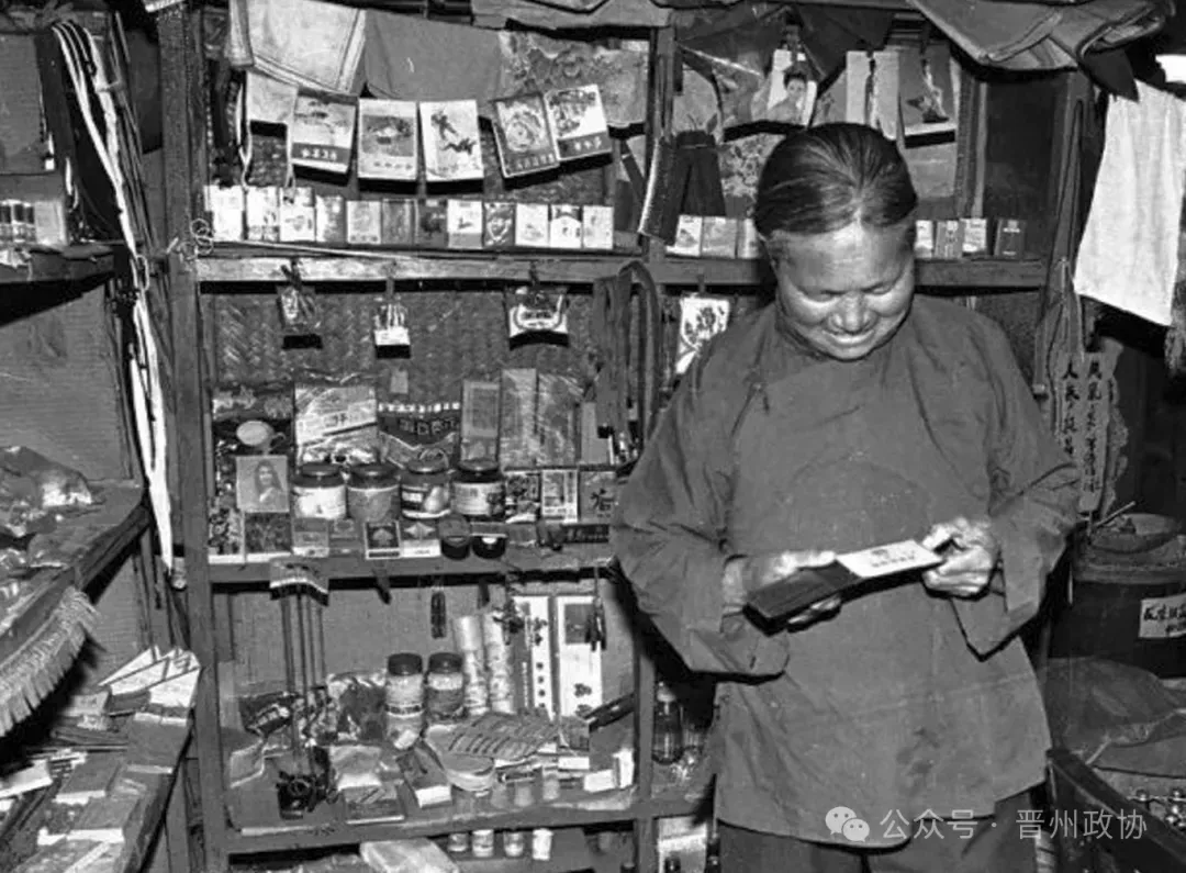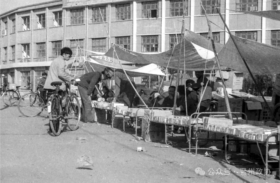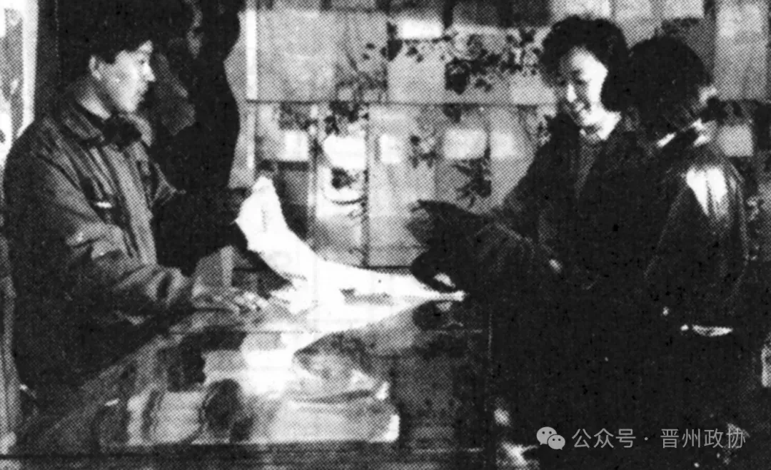 1984年,居民在人民商场选购商品。人民商场,位于车站街(今光明街)1号,1977年10月开始营业,营业面积1600平方米。主要经营五交化、家用电器、布匹百货、针纺织品、文体用品、鞋帽等。这里,曾是晋县居民最爱逛的购物场所。1996年,人民商场因电线短路发生火灾,主体楼一、二层商品全部被烧毁,损失100多万元。1998年关停,后被拆除。