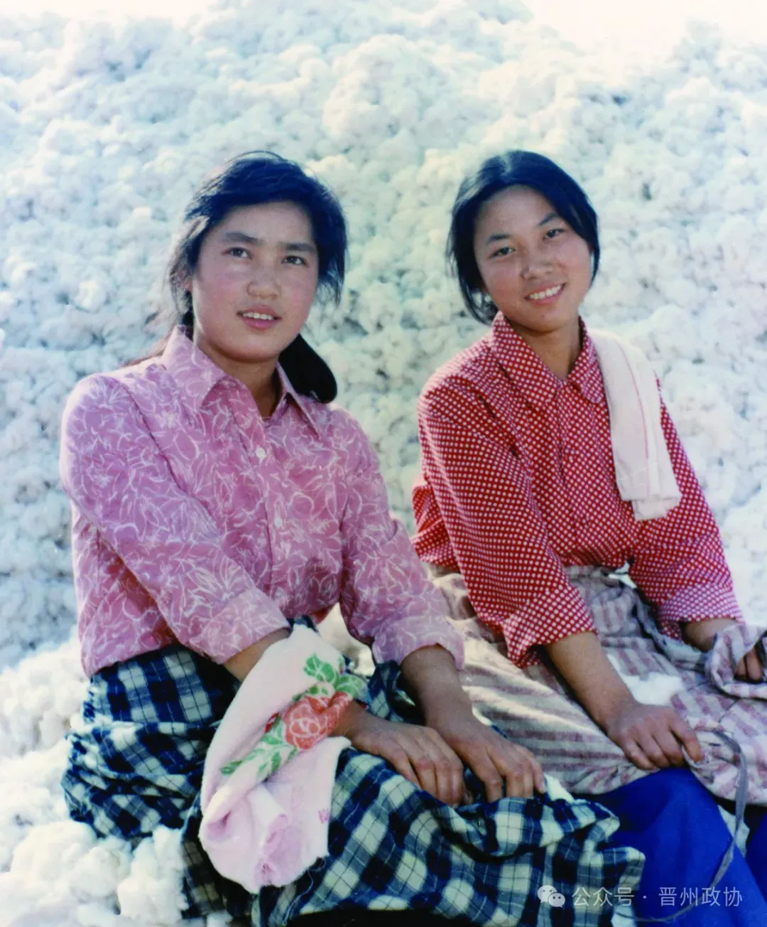 1989年,周家庄乡两位采棉姑娘在棉垛上休息,淳朴的面庞透着喜悦。周家庄乡植棉经验丰富,有“白金之乡”的称谓。