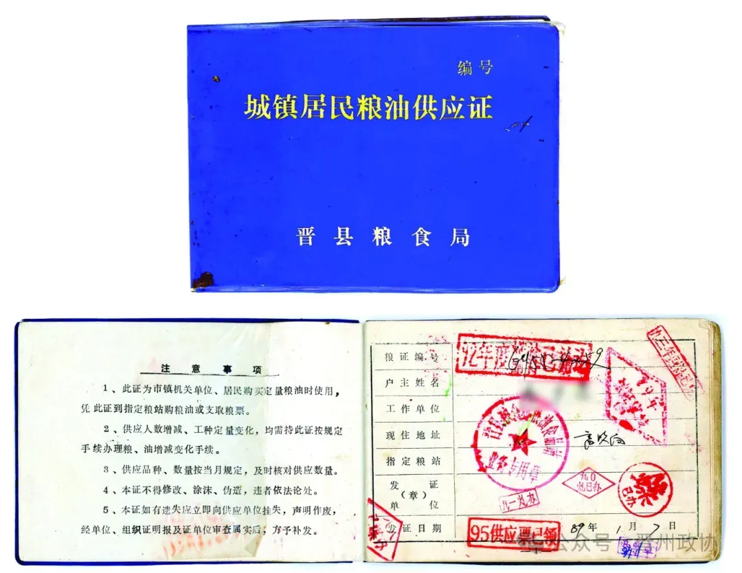 1989年1月,晋县粮食局颁发的居民粮油供应证。上面的印章证明了粮、油、布、煤等多种生活必需品的供应情况。到1995年,商品供应日渐充足,此证进入历史。