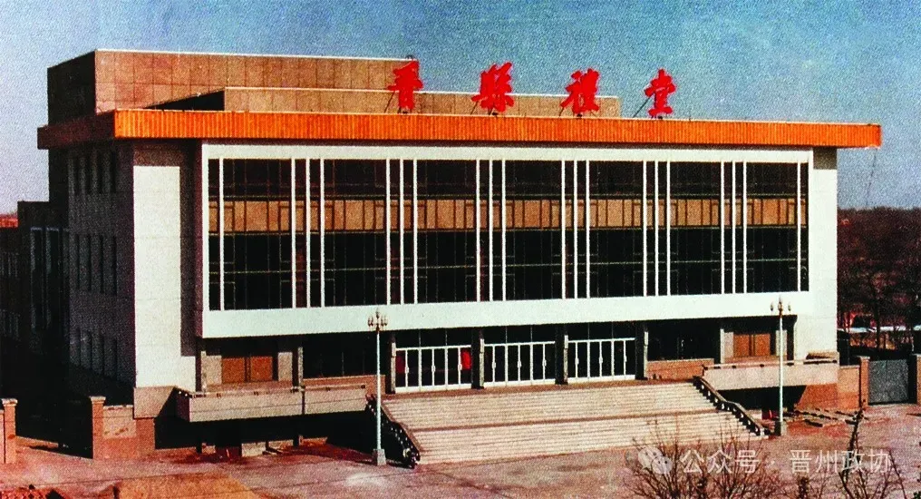 1990年拍摄的晋县礼堂。新中国成立后,人民政府开始积极兴建文化设施。1955年建成晋县礼堂,面积3150平方米。1985年,县投资300万元对礼堂进行翻建,1988年9月完工,面积6559.86平方米,演艺设施更加完善。谷文月、李静文、李琬芬、蒋大为、裴艳玲、张建国等著名的演艺明星曾在这里登台献艺。
