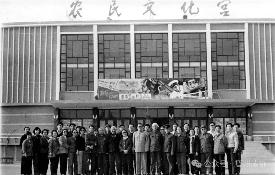 1984年,老社长雷金河与前来参观的人员在文化宫前合影留念。文化宫上的海报,宣传的是当时的热门电影:《都市里的村庄》《蛇案》等。1982年,周家庄乡建起的全省第一座农民文化宫启用。文化宫建筑面积2880平方米。前厅楼3层,底层为过厅,中层为放映室,上层为农民综合学校。1983年12月,省河北梆子剧团在这里进行了首场演出,剧目有裴艳玲主演的《钟馗》、张慧云主演的《李慧娘》等。之后,兼放电影,上座率较高。
