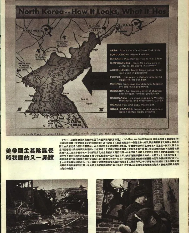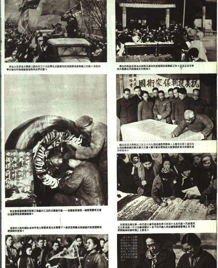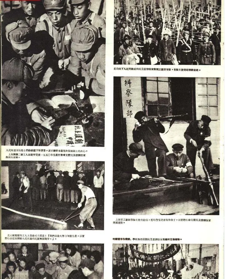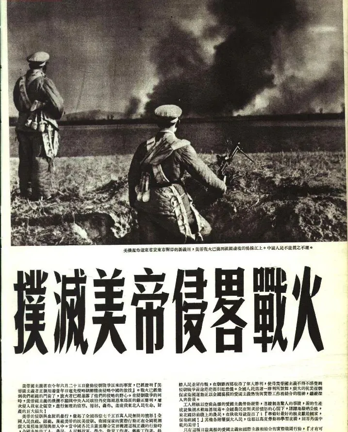 大幅黑白画面,两位解放军士兵背影端着枪站着,黑云如墨,地上一片荒凉,没人喊口号,但劲头都在,“扑灭美帝侵略战火”几个大字,就立在页眉上,扎实得像石块砸下去一样,家里老人以前说过,那时大喇叭才叫响,一句顶一句,全村子跟着喊,铺在田头地尾,真有种大风起兮的排场。